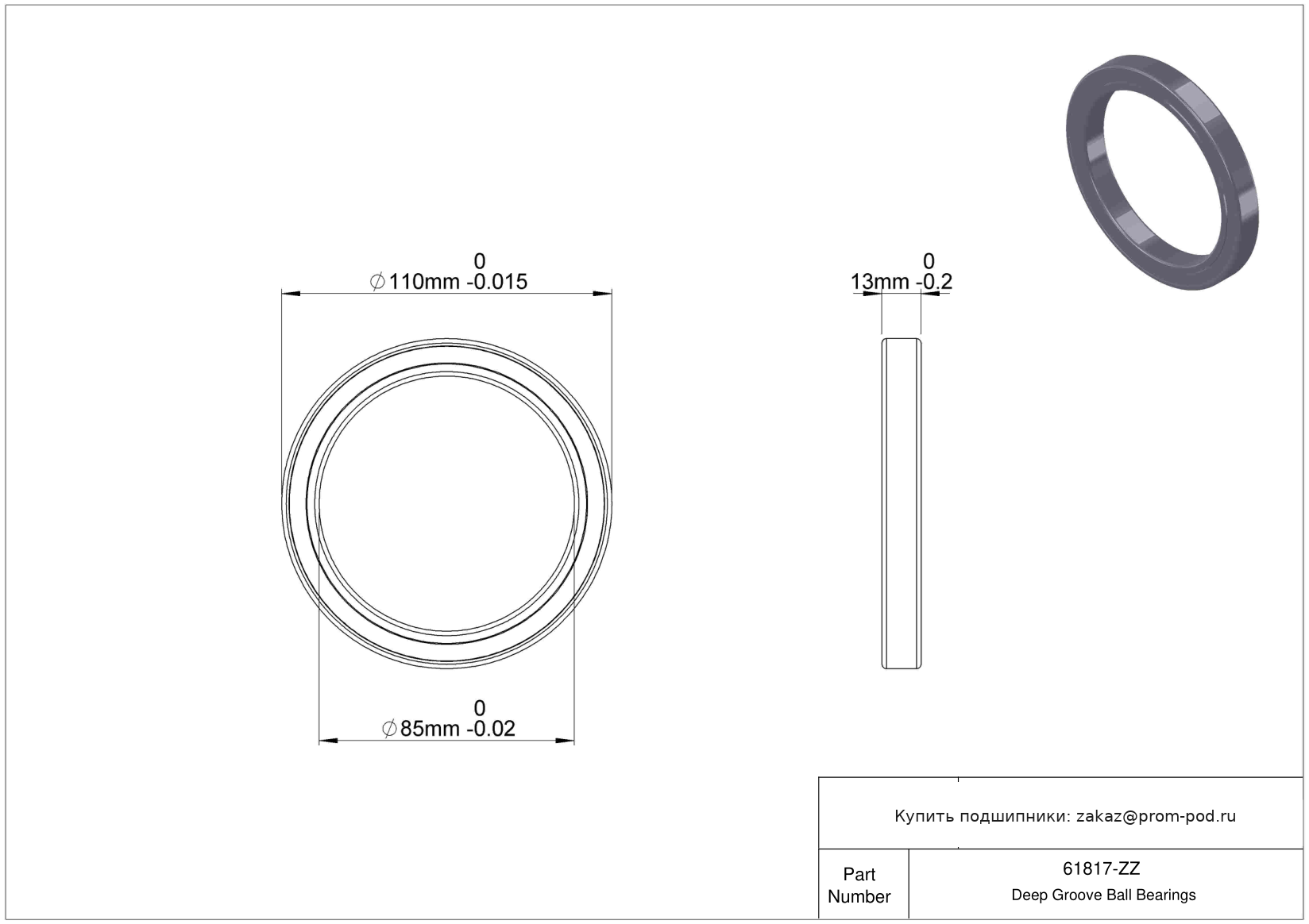 | 6817zz | Шариковый подшипник | Два уплотнителя из синтетического каучука. |